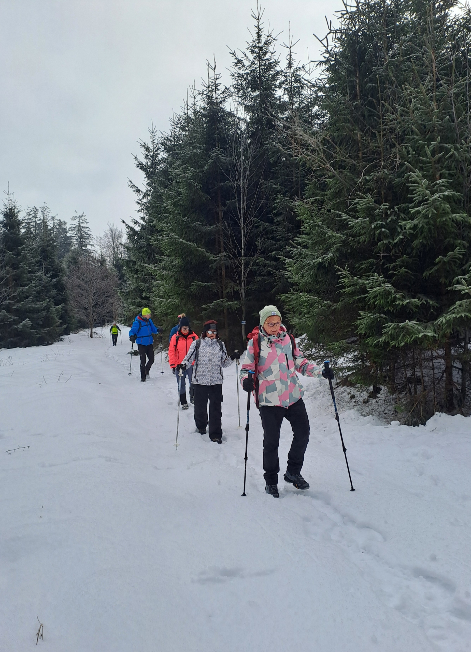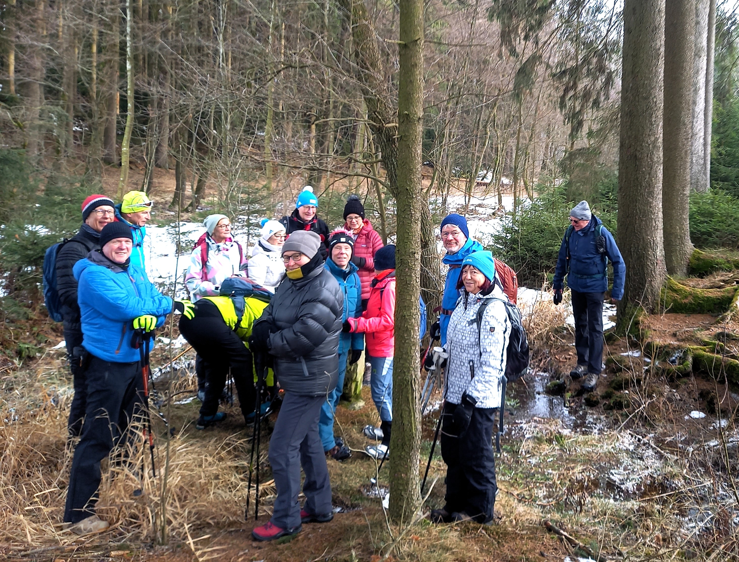 Schneeschuhe? – Gerne! Sie waren eigentlich der Plan für die Wanderung am 23. 1. 2026 auf dem FrankenwaldSteigla „Zum alten Grenzstein“; doch schon auf der Fahrt mit dem Vereinsbus hinauf nach Döbra war absehbar, dass der verbliebene Schnee dafür nicht ausreichen würde; nur ungefähr die Hälfte der Strecke wäre mit Schneeschuhen zu begehen gewesen.