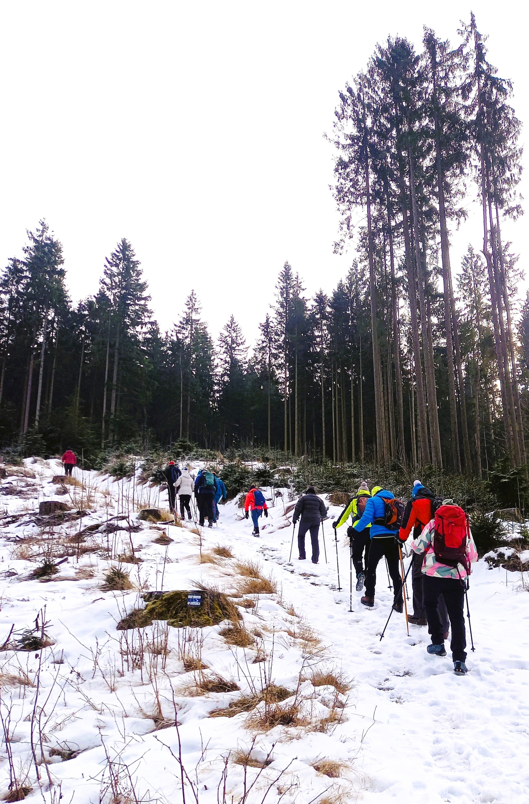 Wanderschuhe? – Natürlich! Wegen einiger vereister Passagen haben wir sie mit Spikes bzw. Grödeln nachgerüstet. So konnten wir die wunderbare Runde über den Alten Grenzstein (mit seiner interessanten Geschichte) zum Gipfel des höchsten Frankenwaldberges genießen.