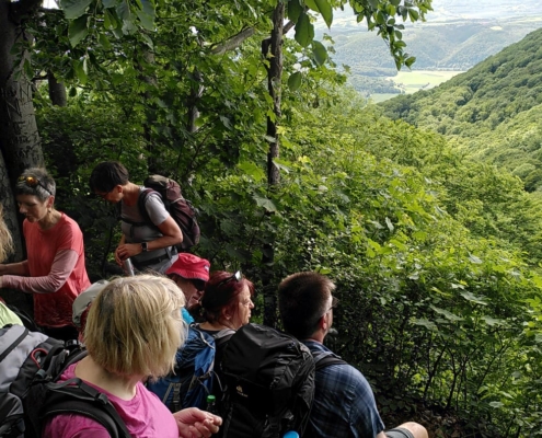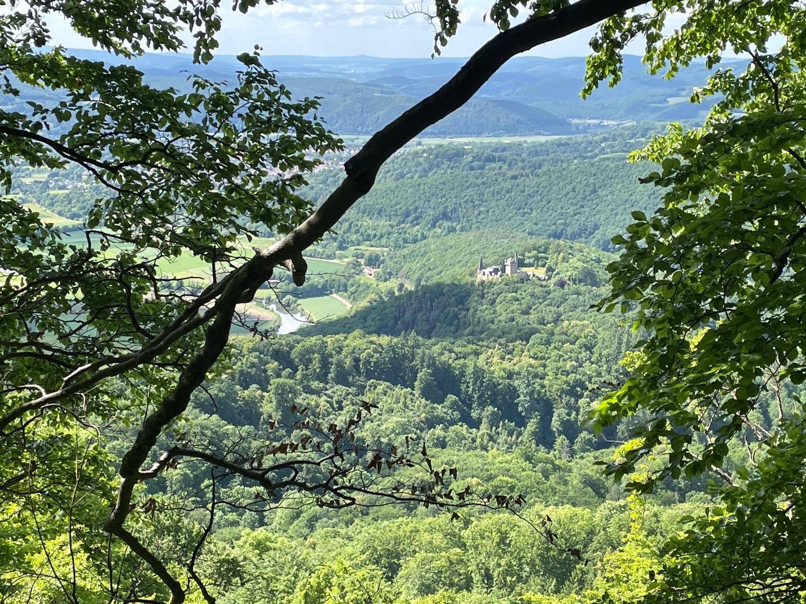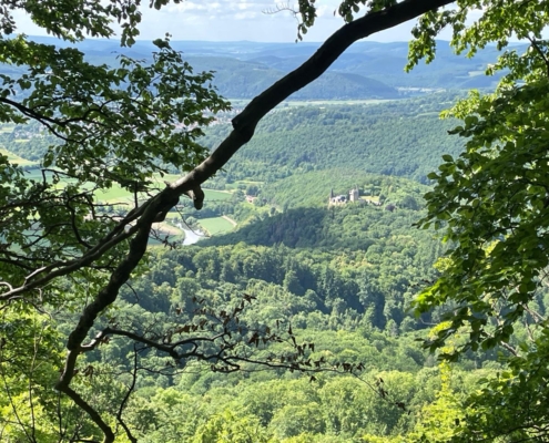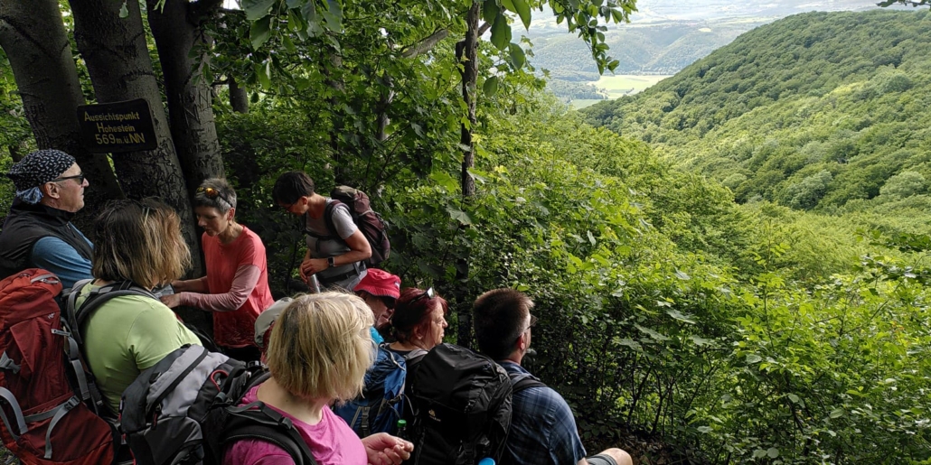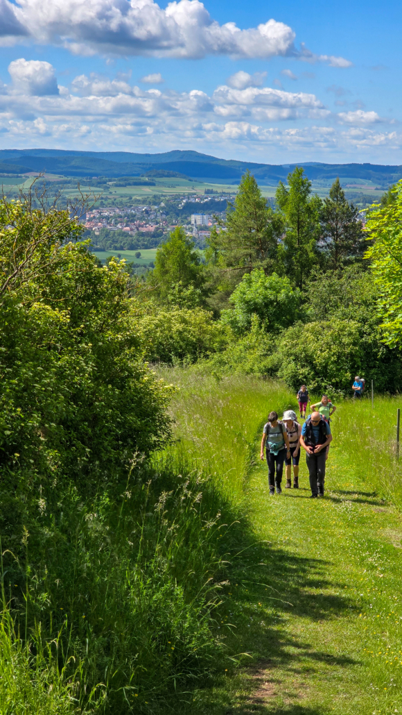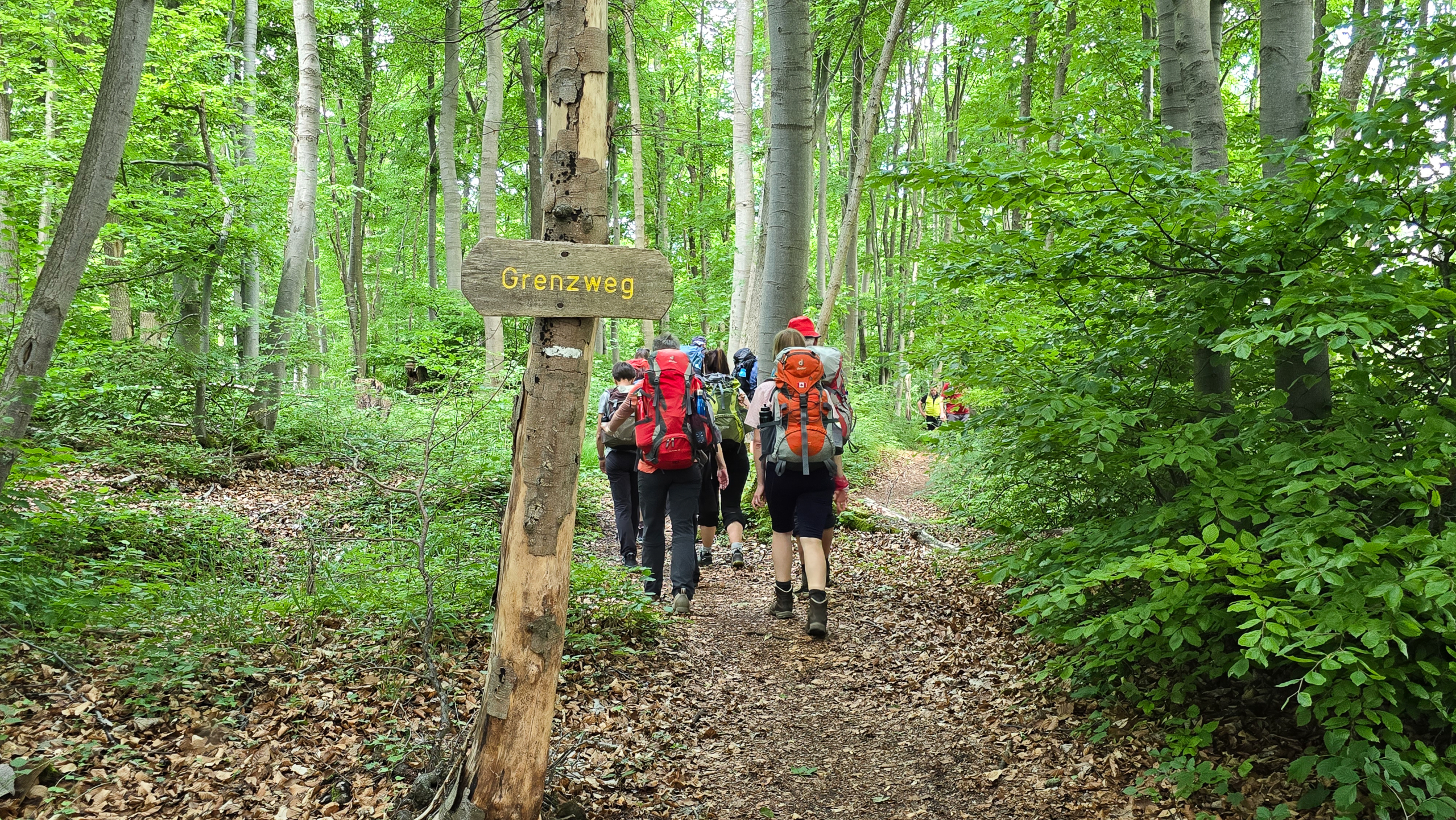 Die zweite Etappe hatte es in sich: Von der Altstadt Eschweges führte der Weg durchs Werratal hinauf in die „Hessische Schweiz“. Knapp 350 Höhenmeter galt es zu überwinden, ehe wir den Meinhard (451 m) erreichten. Von hier aus begleitete uns der Grenzweg auf einem Höhenzug mit weiter Sicht nach Thüringen – bis hin zum Großen Inselsberg. Besonders eindrucksvoll war ein Abschnitt durch urige Wälder, in denen sich Bärlauch endlos ausbreitete und den Weg mit seinem Duft begleitete. Über Hohenstein (569 m) und Hörne (523 m) gelangten wir schließlich ins idyllische Kleinvach direkt an der Werra, wo wir herzlich aufgenommen wurden.