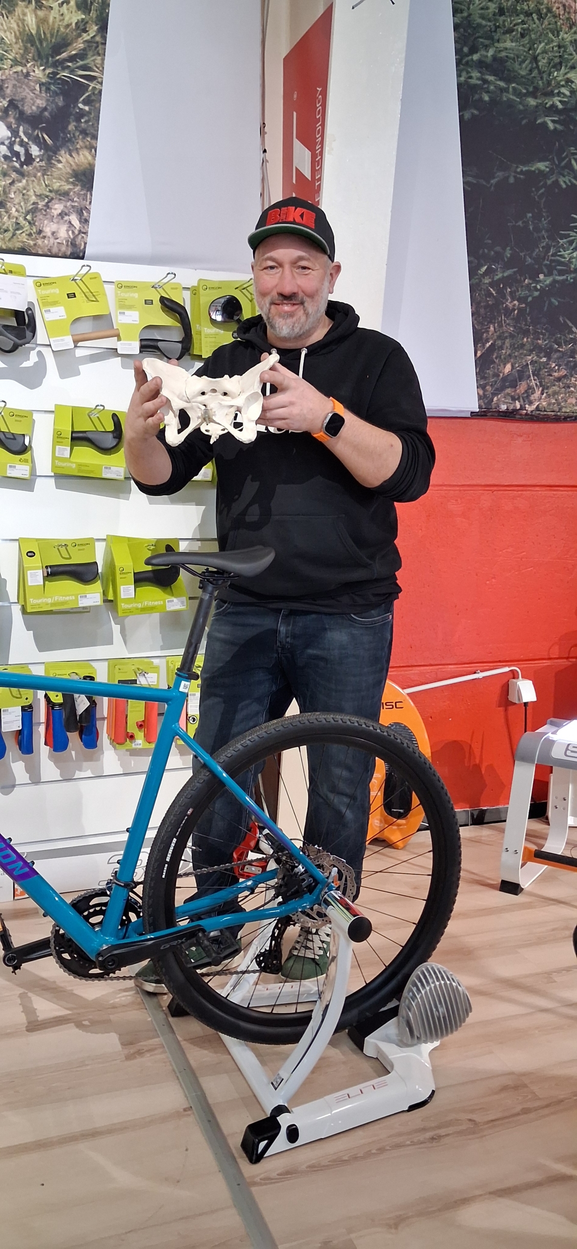 Das fertig montierte Bike von der Stange passt selten optimal zu Fahrerin bzw. Fahrer, da sich die Körpermaße unterscheiden. Beim Teil 2 der Schrauber-Vormittage brachte uns Sebastian bei, wie ein individuelles Set-Up fürs eigene Rad funktioniert. Sehr anschaulich, mit verschiedenen Sattelmodellen, Lenkern, Griffen und einem Sitzbein-Skelett wie aus dem Biologieunterricht. Feine Sache, einmal Maß nehmen und das Bike entsprechend anpassen: Die neue Sitzposition sorgte bei einigen von uns für überraschende Aha-Erlebnisse.
