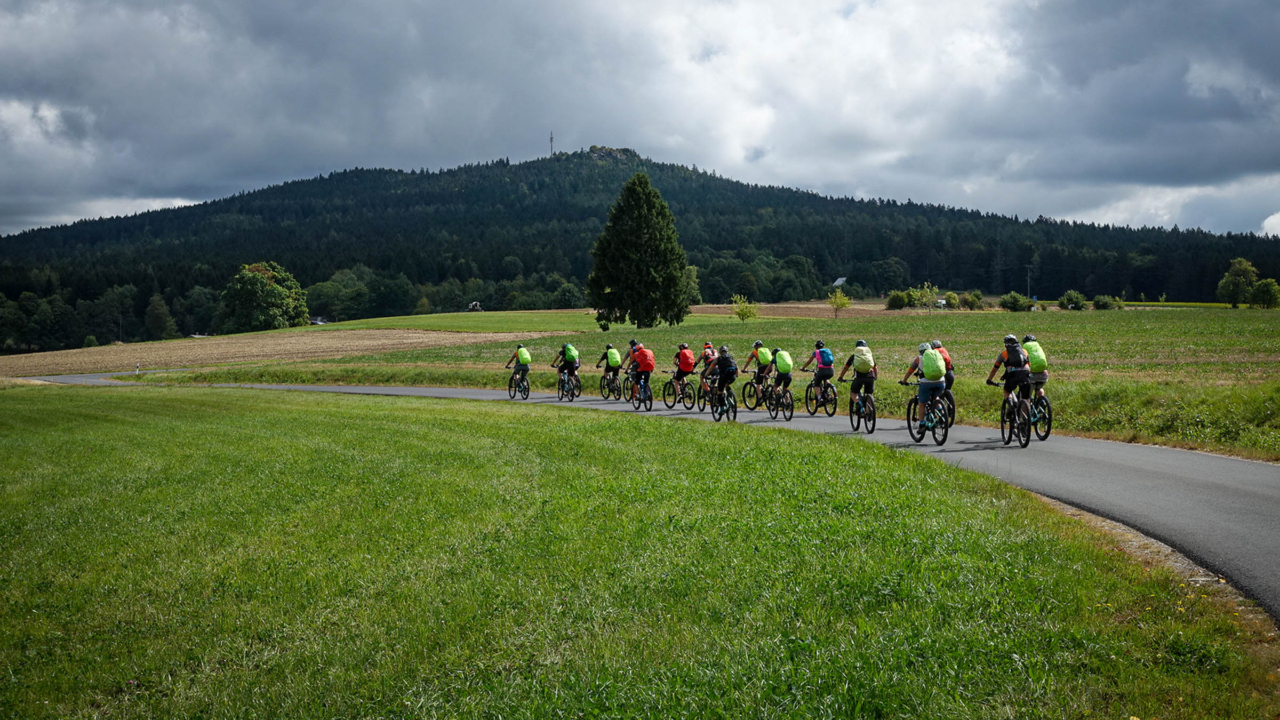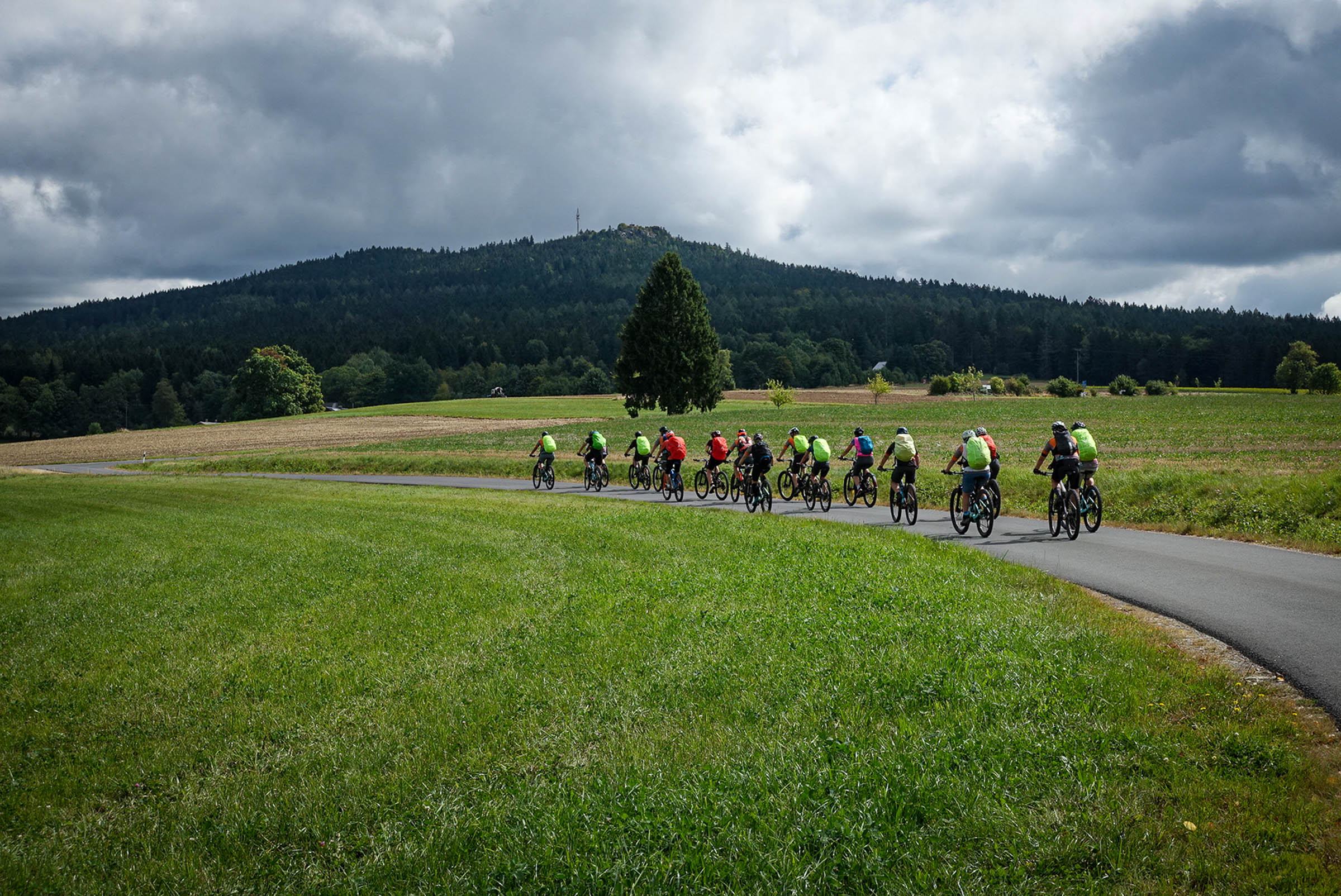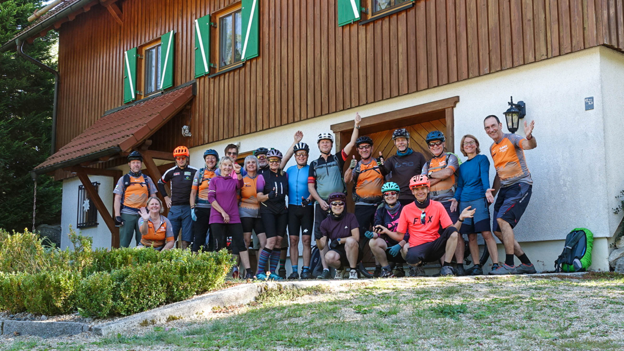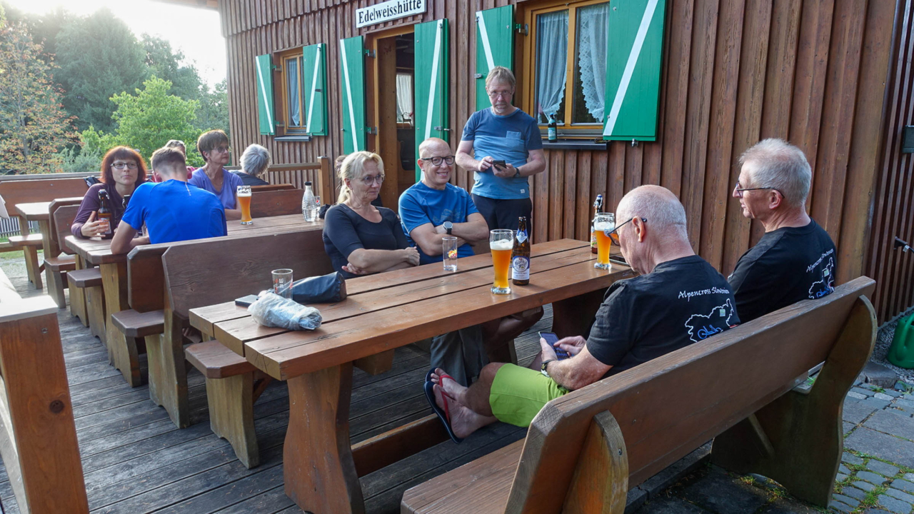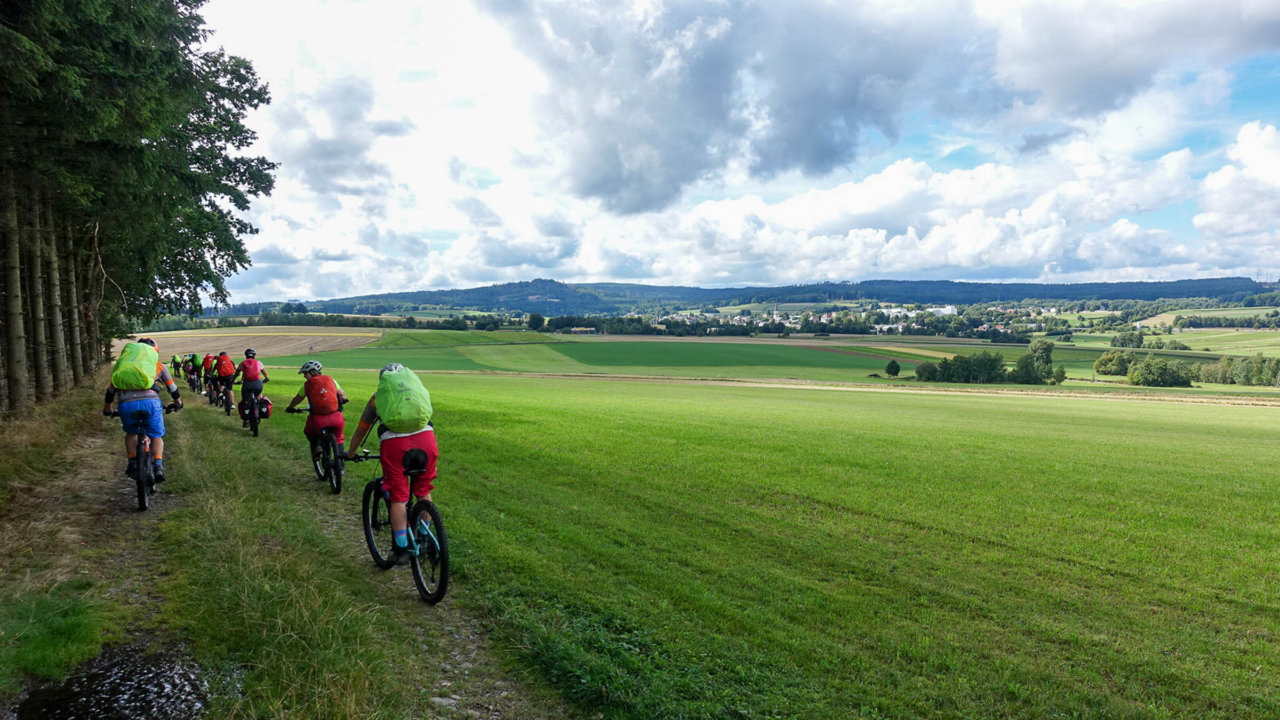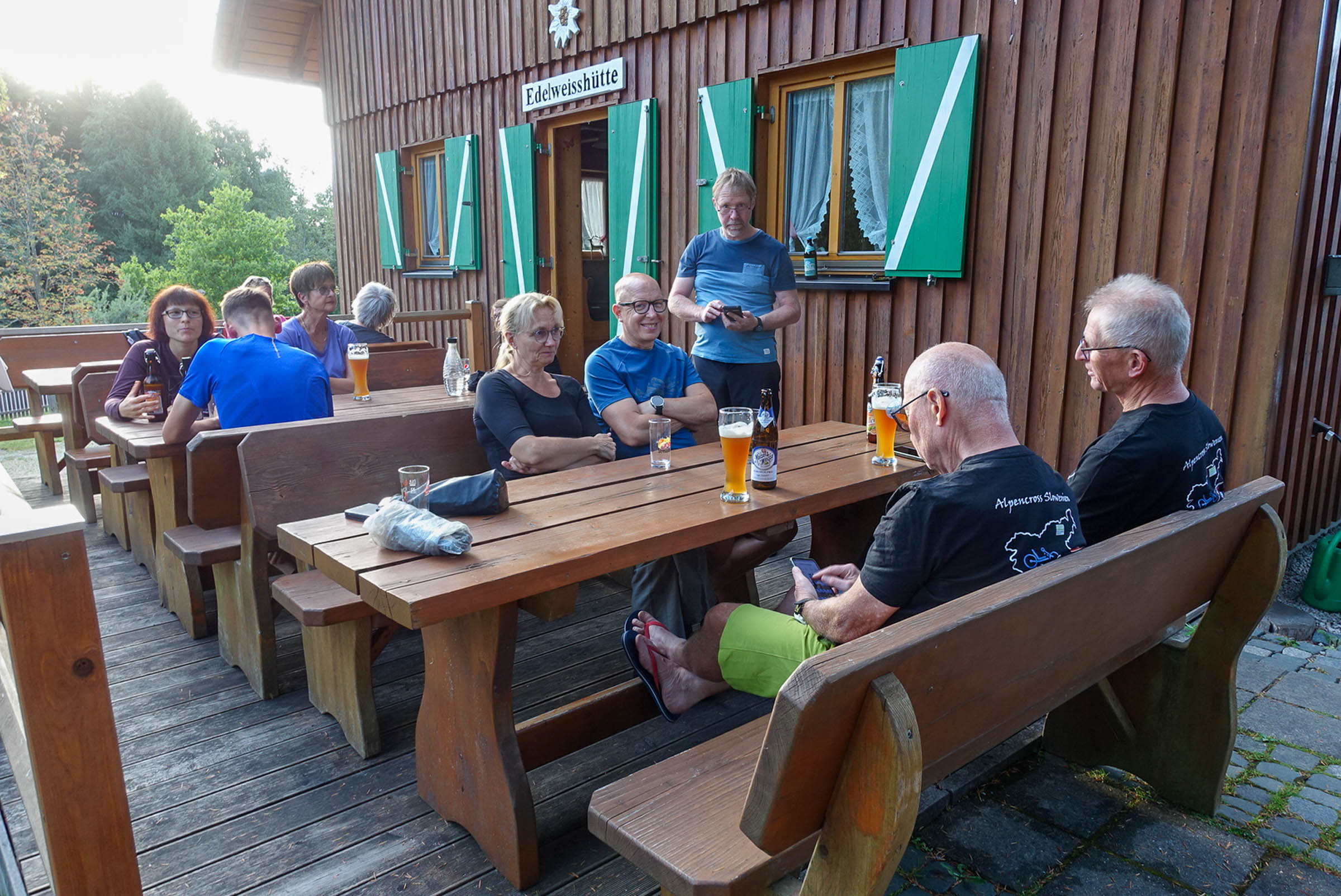 Der Auftakt am Freitag begann typisch oberfränkisch: mit Regen. Also kurzerhand eine Stunde später los – schließlich fährt es sich mit trockenen Klamotten deutlich angenehmer. Vom Untreusee ging es dann zum Hirschstein am Großen Kornberg, wo wir uns die erste Brotzeit schmecken ließen. Weiter über das Epprechtstein-Labyrinth und den Weißenstädter See rollten wir zur DAV-Hütte in Weißenhaid. Dort hieß es erstmal: Betten beziehen, Taschen verstauen, gemütlich einrichten. Am Abend gab es Steaks und Bratwürste vom Grill – dem Grillmeister Lutz sei Dank – dazu Kaminfeuer und Hüttenstimmung: ein perfekter Einstand!