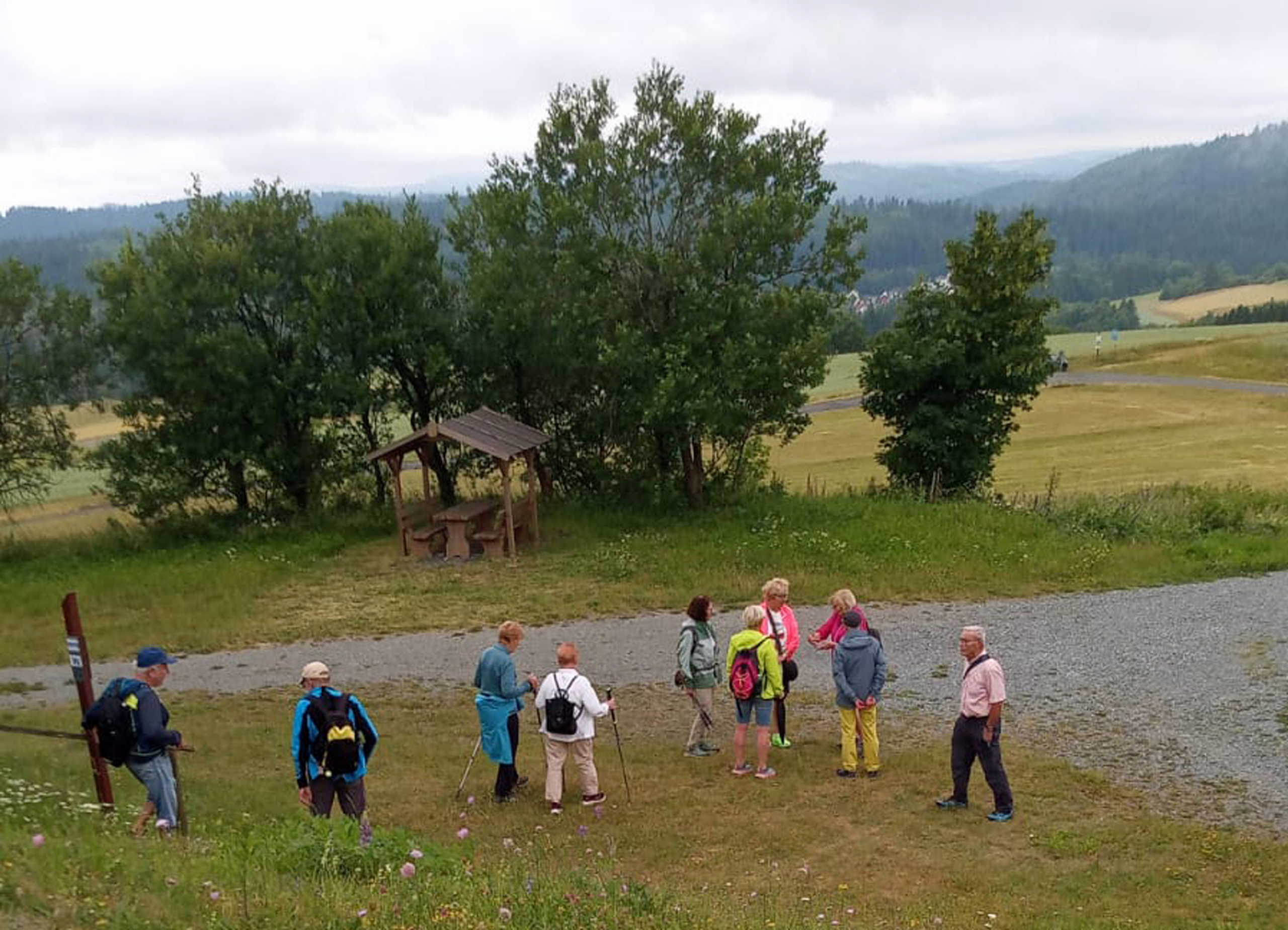 Zum Glück war das Wanderwetter mehr nieselig und so erreichten die Seniorenwanderer die empfehlenswert bewirtschaftete Scheune (scheuna.de) alle im vorgesehenen Zeitrahmen „unversehrt“ und konnten sich mit mannigfachen Brotzeiten und Kuchen wieder stärken.